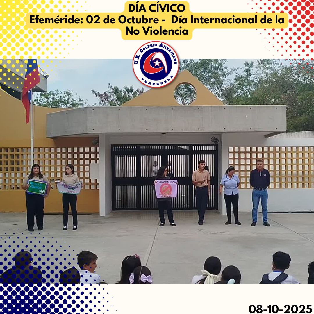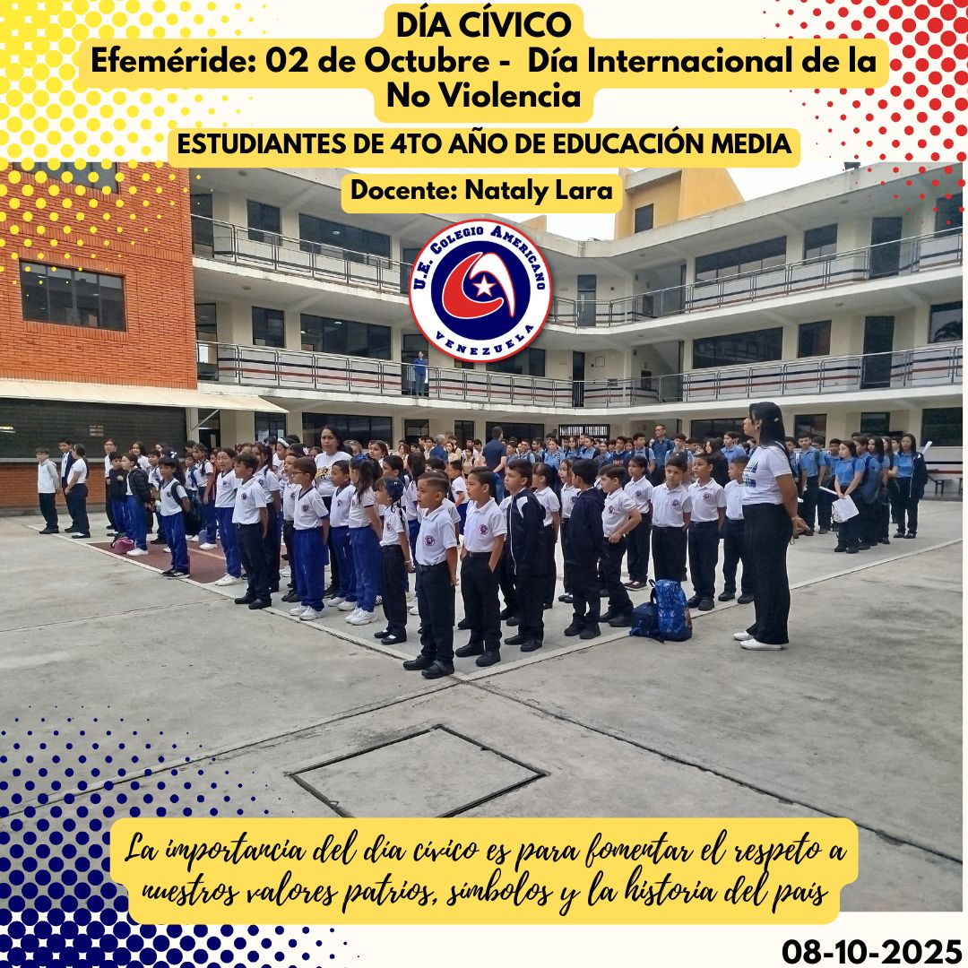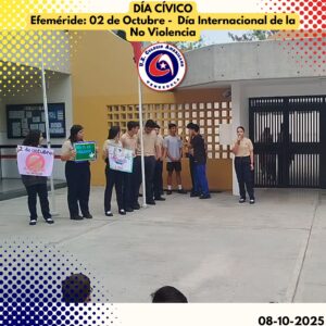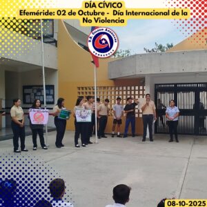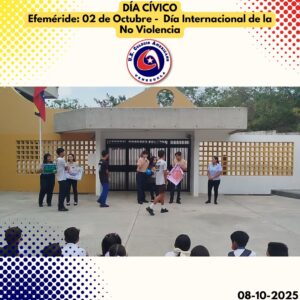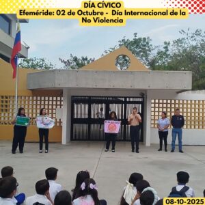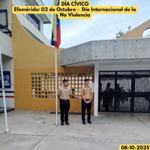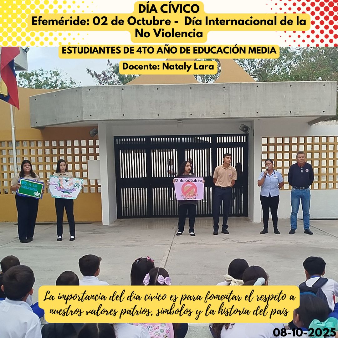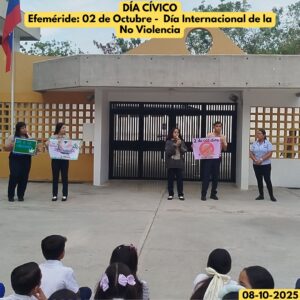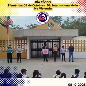 Este martes 08 de octubre, se llevó a cabo el día cívico en nuestra institución, en donde conmemorando nuestras efemérides, recordamos el Día Internacional de la NO Violencia, a cargo de los estudiantes de 4to. Año de Educación Media y la Profesora Nataly Lara. Nuestros estudiantes a cargo de la Profesora, organizaron una presentación en donde el llamado de atención para la concientización sobre el significado de este día, estuvieron presentes en todo momento.