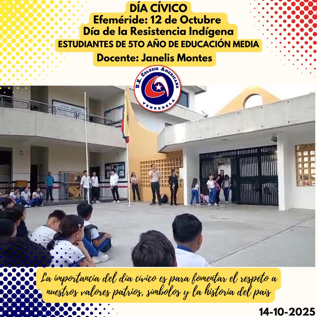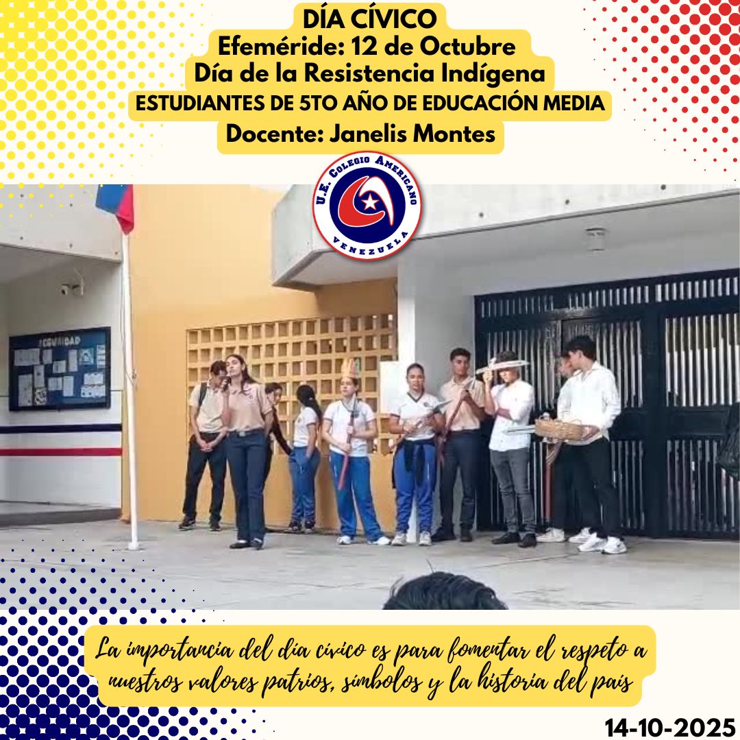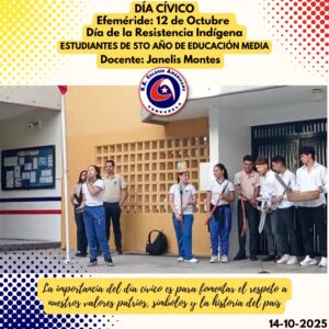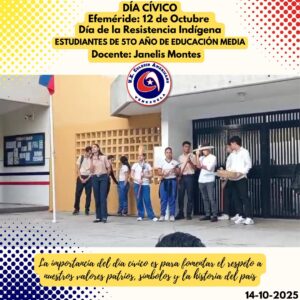 Este martes 14 de octubre, se llevó a cabo el día cívico en nuestra institución, en donde conmemorando nuestras efemérides, recordamos el Día de la Resistencia Indígena, a cargo de los estudiantes de 5to. Año de Educación Media y la Profesora Janelis Montes. La Docente conjuntamente con un grupo de estudiantes de la sección, organizaron una representación del momento significativo que conlleva esta fecha. Entre risas y mensajes de concientización por parte de los estudiantes, se llevó a cabo con éxito dicha actividad.