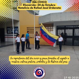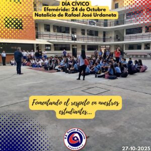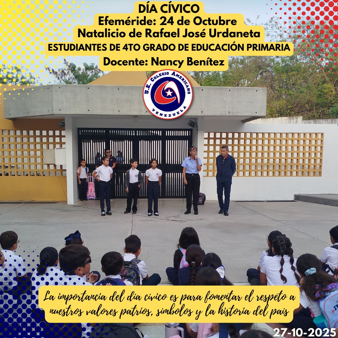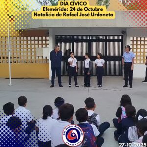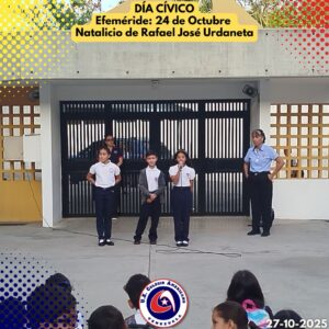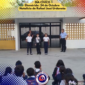 Ayer lunes 27 de octubre, se llevó a cabo el día cívico en nuestra institución, en donde conmemorando nuestras efemérides, recordamos el Natalicio de Rafael Urdaneta, a cargo de los estudiantes de 4to. Grado de Educación Primaria y la Docente Nancy Benítez. En esta oportunidad, la Docente conjuntamente con tres de sus estudiantes, organizaron un pequeño recuento de este personaje simbólico para nuestro país. Recordándolo como persona que se distinguió por su compromiso inquebrantable con la causa independentista.