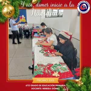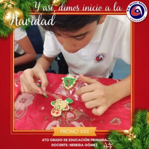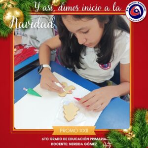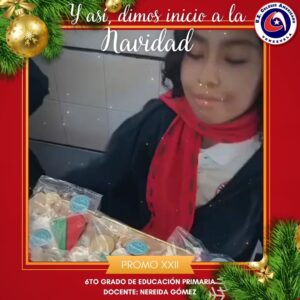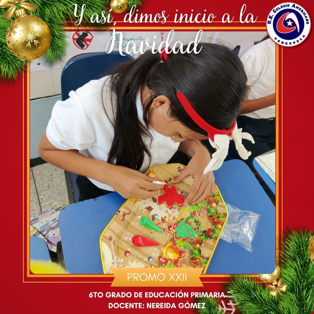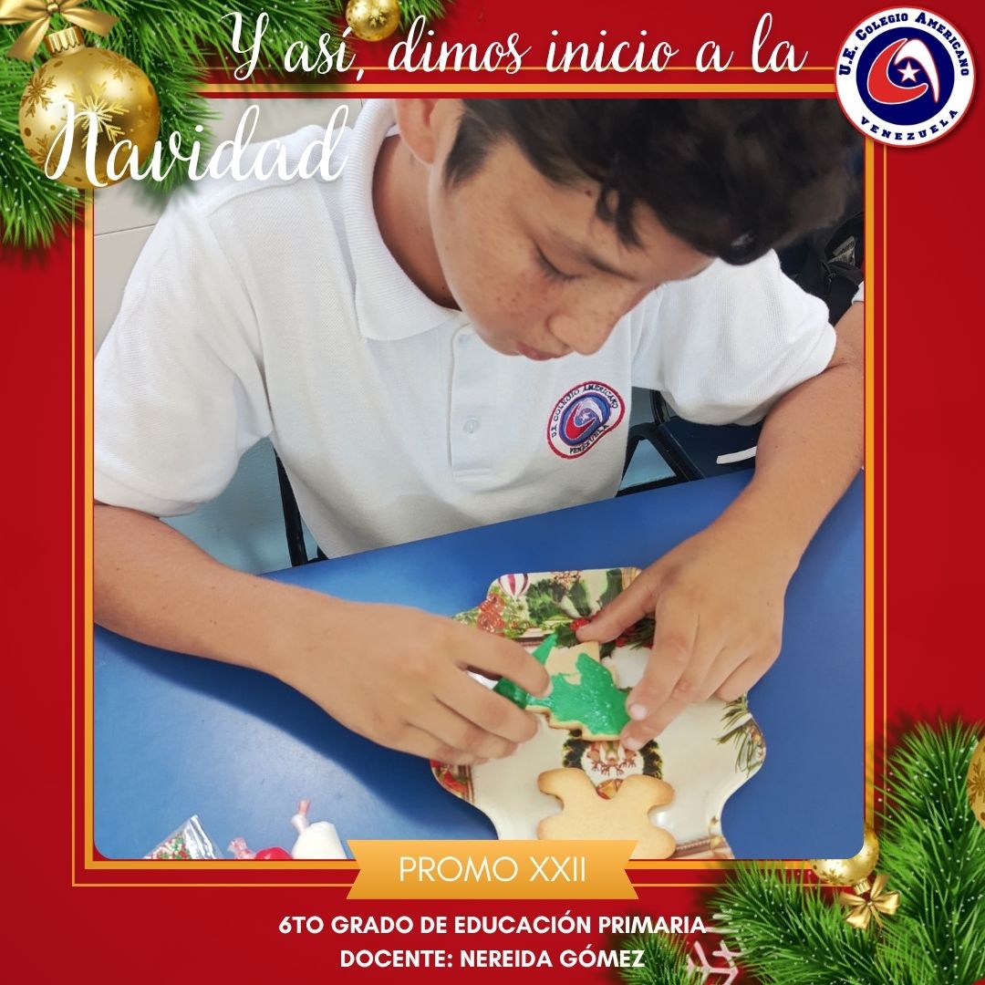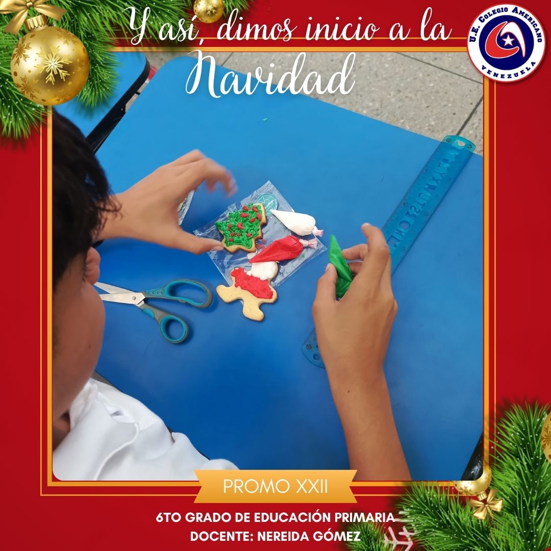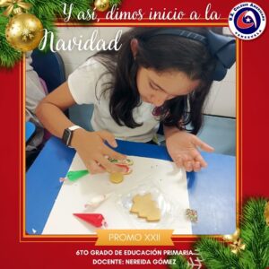 El día viernes 31 de octubre, se realizó en aula de los alumnos de 6to Grado de Educación Primaria, una actividad que marcó el inicio de la Navidad para Ellos. El Comité de la Promoción XXII de los estudiantes, organizó conjuntamente con su Docente, la Maestra Nereida Gómez, la adquisición de un kit de galletas de Navidad, en donde cada estudiante tenía la oportunidad de decorar dos galletas a su gusto. Actividad que representó en Ellos, la Ternura, Alegría y Unión.